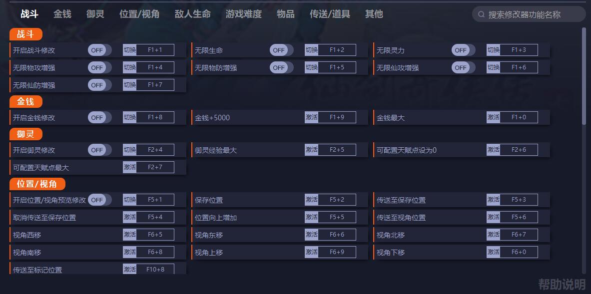3.开启修改器各主初始项再使用各子修改项[无主初始项则不用开启][主初始项:如开启...修改]。