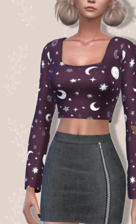模拟人生4女性月亮星星上衣MOD在《The Sims 4》游戏内增加了一款个性的女性短款上衣,这款上衣印有银白色的弯月、满月与各式各样的星星形状,非常好看。衣服比较短,可以露出角色的腰肢,而且融合了方领和长袖设计。
