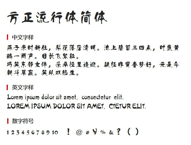 特点更突出,就好像是墨水滴下来自然流动形成的字体,风格更独特,让你一眼就注意到方正流行体简体的与众不同。笔画简洁,该字体还在笔画上做了一些简省,让风格更突出,整体形状没有较大的变化,识别起来还是非常方便的,使用起来更便捷。