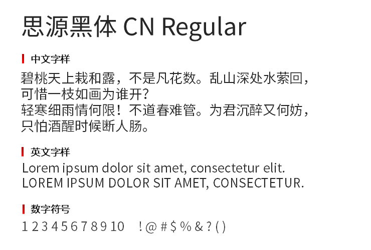 线条粗细适中,整体看上去更舒服,结构严谨,更显端庄,外形方正,书写出来的效果更工整,更显规矩,书写也非常讲究,更有章法,不会显得杂乱。思源黑体CN Regular结构端正,书写规范,笔画简洁,书写起来更流畅,书写出来的效果更自然,看着更顺眼。