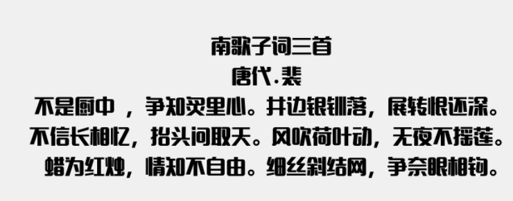 在黑体的基础上不断发展,汉仪铸字美心体W对撇做了简化处理,整体看上去更清爽,一点都不费眼,横平竖直,特点突出,笔画粗细均匀,整体看上去更美观。笔画简洁,书写起来更流畅,行笔有力,该字体将刚与柔做了更完美的结合,整体看上去更和谐,不觉违和。