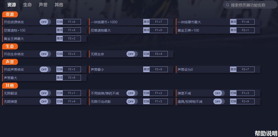 3.开启修改器各主初始项再使用各子修改项[无主初始项则不用开启][主初始项:如开启...修改]。