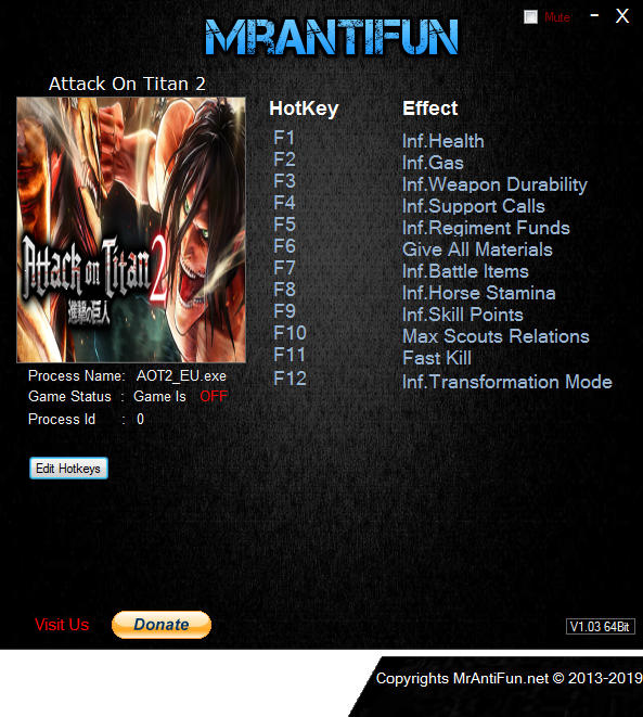以上就是关于进击的巨人2十二项修改器MrAntiFun版的简单介绍,会给你提供更多实用的游戏辅助软件,让你能有更好的游戏体验,想要了解更多的话就请来游戏爱好者逛逛吧!