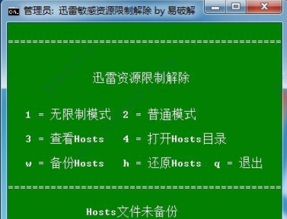迅雷敏感资源限制解除小工具是迅雷平台带来的快捷本地资源下载辅助工具,具体就是深入电脑的程序指令模式,点击无限制模式,普通模式,Hosts信息,打开Hosts目录,备份Hosts等参数管理,具体就是让既定的限制加速解除,以达到自己满意的资源搜索分析以及批次化下载需求。