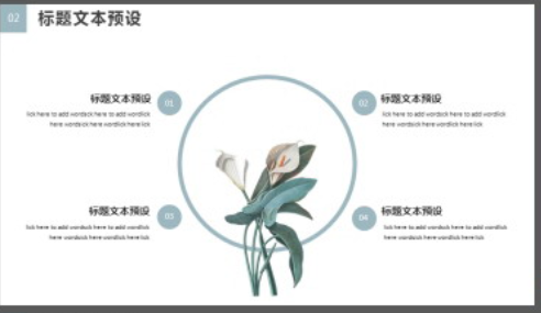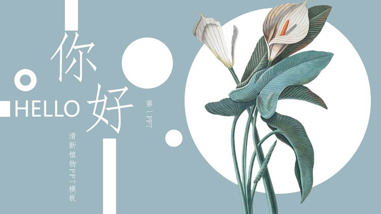 背景颜色较淡,风格清新,整体看上去更觉舒服,呈现出的视觉效果更佳,配图多为一些植物,看着不觉费眼,颜色清新,整体看上去更显柔和,看着更觉亲切。精美清新白掌植物背景的你好主题PPT模板颜色浅淡,修饰元素较少,不显得花哨,看着更舒服,不觉累眼。