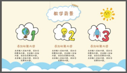 色彩鲜艳,更显活泼,整体看上去更有活力,修饰元素更可爱,整体看上去更有趣,更富童趣,整体看上去更美观,呈现出的效果更佳,看着更舒服。可爱卡通风教学说课PPT模板带有较为明显的手绘痕迹,风格更独特,整体看上去更顺眼,看着更漂亮,给人的印象更好。
