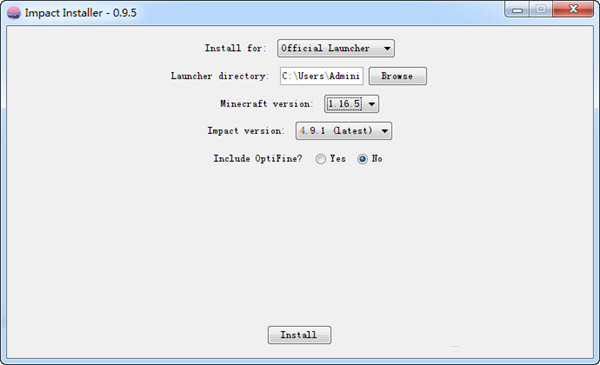 第二种方式就是运用EXE客户端,期待加载,加载完以后,点击Browse,选择你装载MC的阿谁.minecraft文件夹,然后选择游戏版本,一切筹办好就点击install。呈现impact has been successfully就代表装载成功了。