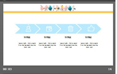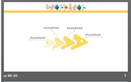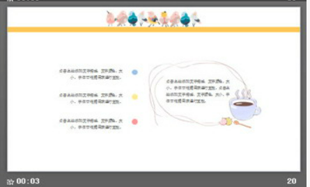 颜色明亮,整体看上去更觉活泼,看着非常精神,不会显得死气沉沉,给人的印象更佳,整体看上去更有活力,看着也非常得体。可爱卡通小鸟PPT模板使用不同的造型修饰边框,整体看上去非常独特,也非常有创意,整体看上去更美观。