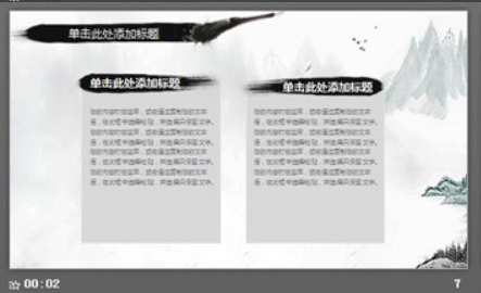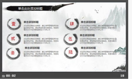 颜色浅淡,色彩柔和,整体看上去更舒服,看着也非常亲切,整体呈现出更惊艳的视觉效果,让人顿觉眼前一亮,整体看上去更漂亮。淡雅水墨国画中国风PPT模板使用水墨山水作为背景,整体看上去更觉大气,风格清新,看着也非常大方,看着优雅。