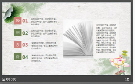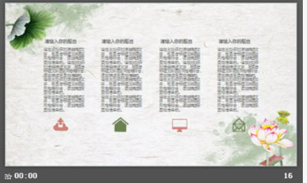颜色浅淡,色彩柔和,整体看上去更顺眼,看着不刺眼,看着也非常得体,用在那些较为正式的场合不觉违和,呈现出更醒目的视觉效果。简洁小清新夏日荷花PPT模板使用水墨图案作为背景,风格大气,整体看上去更大方,看着也非常自然,看着优雅。