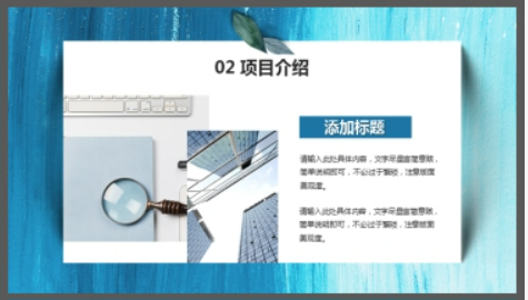 颜色浅淡,色彩柔和,整体看上去更舒服,呈现出更惊艳的视觉效果,整体呈现出较为明显的油画风格,整体看上去更有趣,看着也非常独特。蓝色油画叶子小鹿背景公司介绍PPT模板使用一些较为精美的图画作为背景,整体看上去更漂亮。
