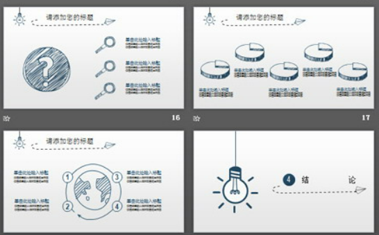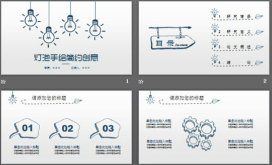 颜色简单,使用蓝色作为主题色,整体看上去更觉稳重,用在那些正式场合不觉违和,看着非常得体,呈现出更醒目的视觉效果。蓝色简洁手绘灯泡背景的开题报告PPT模板界面简洁,风格清新,整体看上去非常漂亮,看着非常优雅。