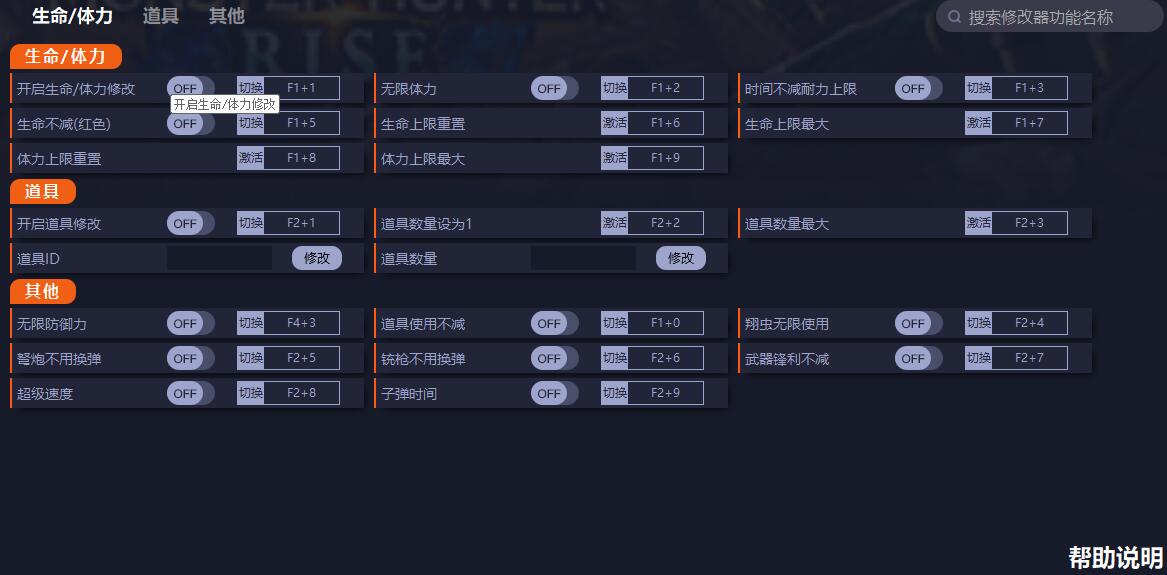 3.开启修改器各主初始项再使用各子修改项[无主初始项则不用开启][主初始项:如开启...修改]。
