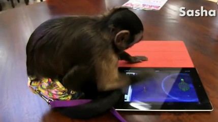 去年一只小猫在iPad上玩《水果忍者》的视频在互联网上广为流传,不过猫科动物毕竟无法和人类近亲灵长类相比。美国休斯顿GalleryFurniture商店的吉祥物是两只小猴子Sasha和Thor,某天有胆大的顾客拿自己的iPad试验让它们玩新近发布的《愤怒的小鸟:太空》,幸运的是两只吉祥物不仅没有将iPad弄坏,Thor还以三星成绩过了一关。