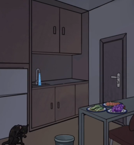 捡起柜子下面的纸条查看上面的规则,吃掉桌子上的食物。