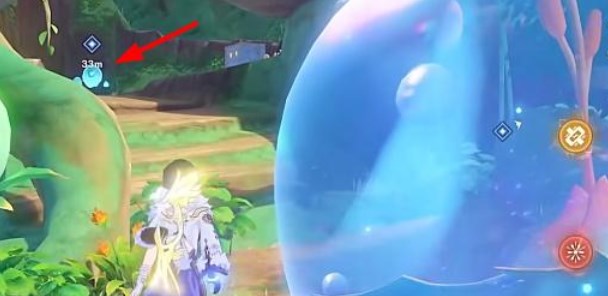 2、来到目标位置以后,一直往前走可以看到下图的蓝色水泡,交互以后解锁任务【寻找水形幻灵0/3】。