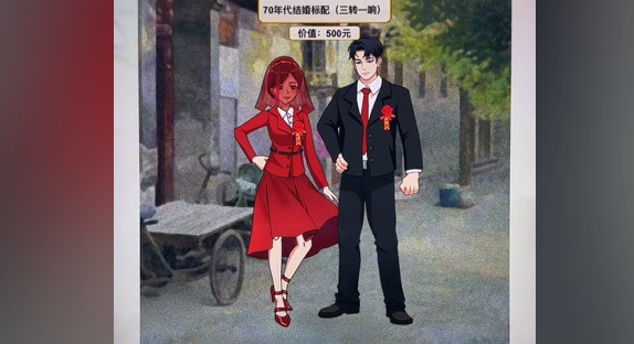 70年代:红色衣服头饰+缝纫机+收音机+手表+自行车。