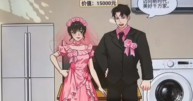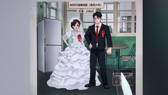 90年代:粉色婚纱+双开门冰箱+彩电+空调+滚筒洗衣机。