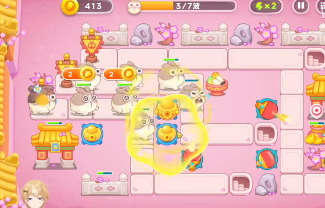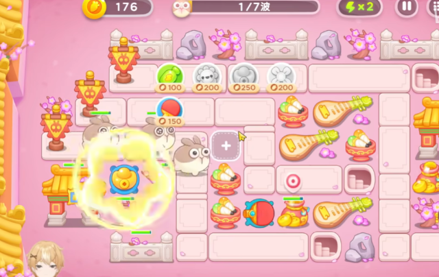 2、继续在中央建造元宝和右侧建造乒乓球来补足伤害防止漏怪。