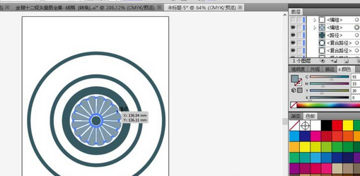 然后复制这个圆形等比例缩小让其成为同心圆形,最里面的一个圆形边缘比较大,我们可以用两个圆形截取出来制作。