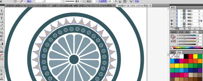 这时候在花瓣外的圆形弧线上面绘制小小的同心圆形并填充为淡青色,圆心为淡褐色。有了一个圆心之后再计算一下整个圆形需要多少个,等比例的复制与改变角度。