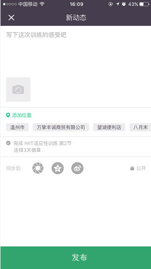 2、训练完成后点击“继续”按钮,再点击“发布动态”按钮;