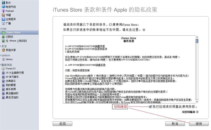 第四步,在看过Itunes store条款和条件apple隐私政策后,在“我已经阅读并同意此使用条款”前打钩,并按“继续”;