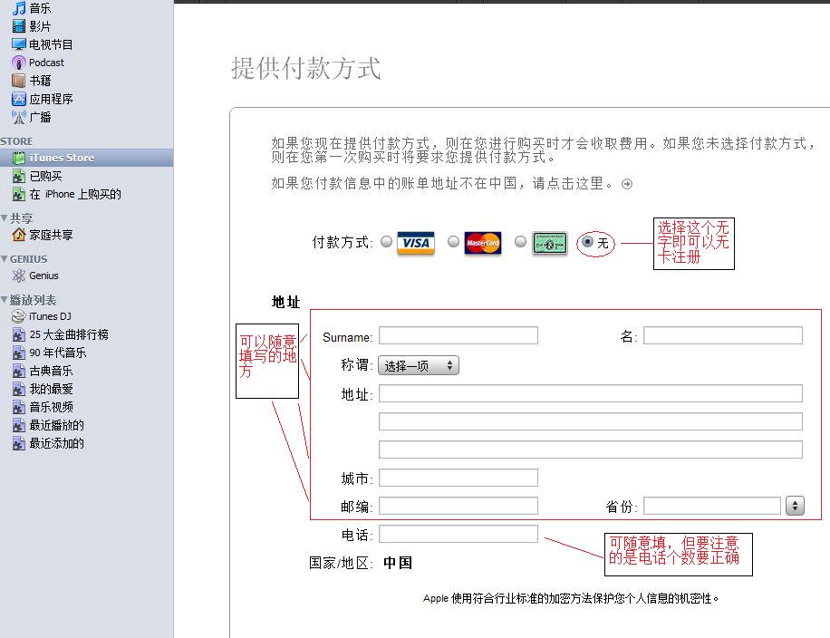 第六步,上述信息正确录入后,点击确认,进入“提供付款方式”页面。这时,我们能看到付款方式一栏最后有个无字,点选它,把下面的信息填写完毕后(如何填写,请看下图),即可生成无卡注册;