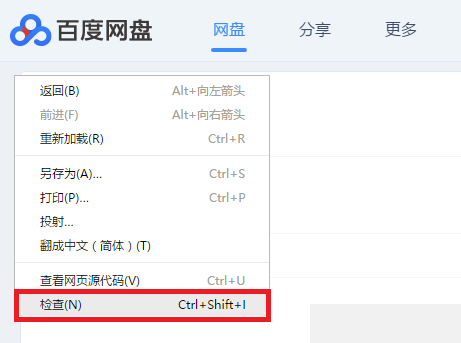 首先咱们用Chrome浏览器打开百度网盘的文件下载页面,直接按F12调出控制台,或在空白的地方点击鼠标右键,然后选择“检查”一项也行,随你喜欢了。