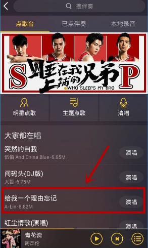 3、在点歌台你可以选择自己想唱的歌曲,这里以《给我一个理由忘记》为例,点击右侧的“演唱”;