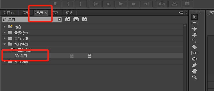 在左侧“效果”面板里找到“黑白”效果。(视频特效—>图像控制—>黑白)。