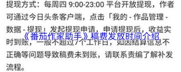 首先,要知道番茄作家助手稿费发放时间是有规律可循的。一般来说,每月会有固定的发放周期。当你在平台上创作的作品达到一定的收益标准后,就进入了稿费统计范围。