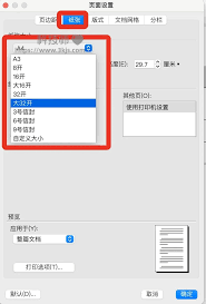 在下拉菜单的底部,点击“自定义大小”选项。这时会弹出“页面设置”对话框,其中就有纸张大小的设置区域。