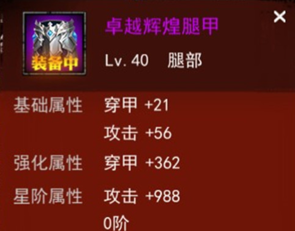 游戏中的装备有8件,分别是头部、胸部、武器、腿部、护石、戒指、项链、腰带,每一部位的装备都加成两项不同的属性,我们称它为主属性与副属性。在游戏过程中,玩家会不断更换更强的装备,比如小编就从一身1级白装开始,慢慢地换上了一身40级一身紫装,战斗力棒棒的!
