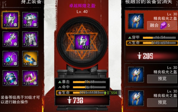 30级以后开放的符文融合玩法,可以让我们将一些不需要的装备作为材料,融合进身上同部位的装备中,提升符文属性。符文的融合需要消耗符文精华,这项资源可以在宝箱,潘多拉魔盒中获取。如下图,当作为融合材料的装备如果与身上的装备有相同的属性类型,则融合时会更升更多的数值。现在知道30级之前攒的装备怎么用了吧!