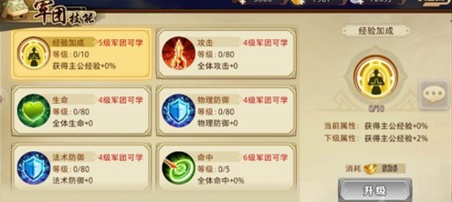 当军团等级到达4级,主公可消耗军团贡献值,购买或升级军团技能。军团技能将为主公提供各种增益BUFF,如经验加成、生命、攻击、命中等基础数值加成,以及伤害加成、暴击、暴击抗性等百分比加成。