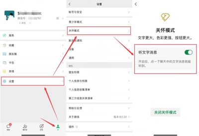 首先,打开微信,点击界面右下角的“我”。然后在打开的页面中找到“设置”选项并点击。进入设置页面后,下滑找到“关怀模式”。开启关怀模式后,微信的界面会变大,文字也更清晰,方便长辈查看。
