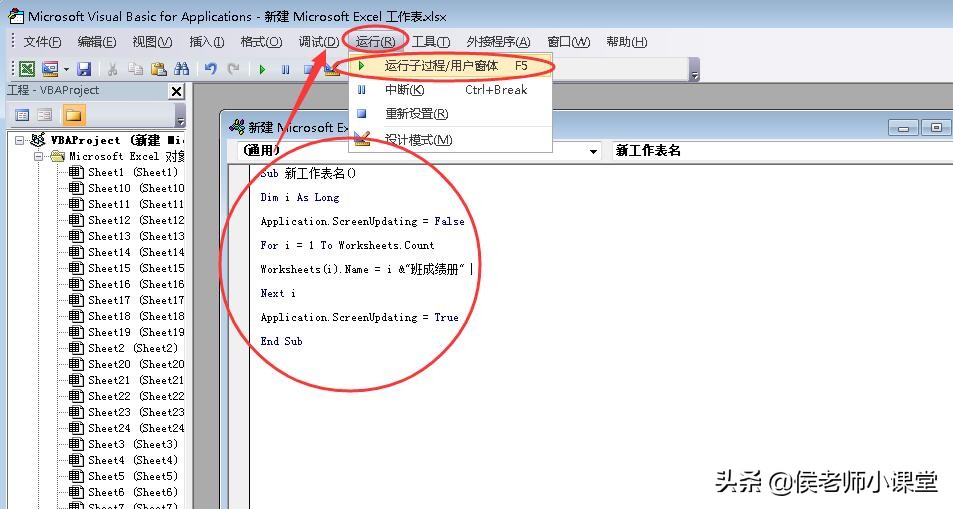 5. 修改完成后,关闭代码窗口,回到excel界面。运行宏,即可批量重命名工作表。