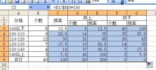 在excel中操作方法类似。选中要输出频数的单元格区域,输入函数=frequency(数据范围, 分组区间数组),同样通过ctrl+shift+enter组合键来计算。