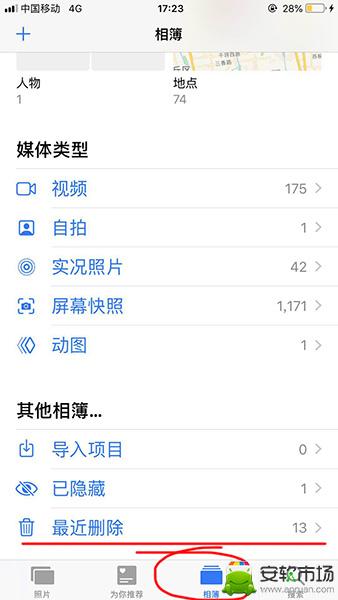 2、接着选择底部的【相薄】,在相薄中找到【最近删除】功能点击进入;