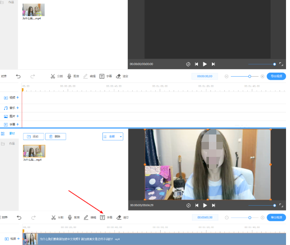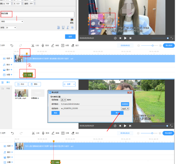 最后我们输入字幕的文字,将轨道上的时间轴移动到字幕文件上,此刻字幕就会显示在右侧窗口。拖动窗口上的字幕,调整它的出现位置,之后再次添加其他字幕,点击这个【导出视频】即可。