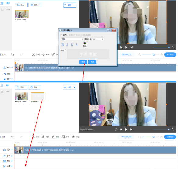 再点击【创建】,得到一个字幕模板,然后把模板拖入到字幕轨道,这里根据你的实际需要进行创建,