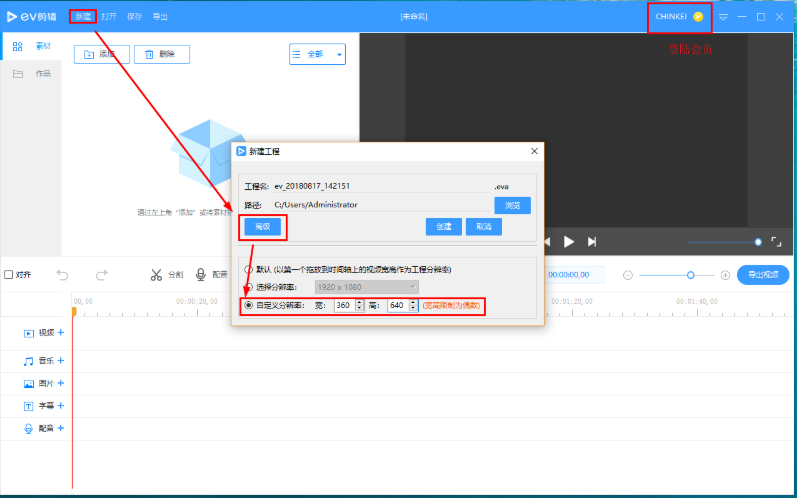 我们需要先打开EV剪辑工具,点击【新建】,选择高级,将分辨率自定义为360X640(或其他),新建画布。