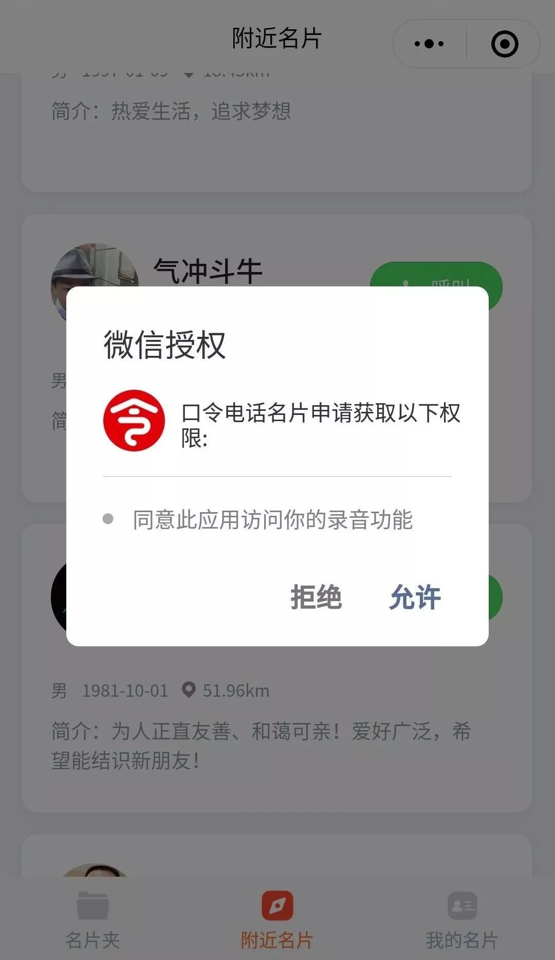 点开通讯录,点击“我”的主页,你会发现这个小程序跳转入口,但第一次需要你授权同步,完成授权页面即可跳转至「口令电话名片」这款微信小程序。