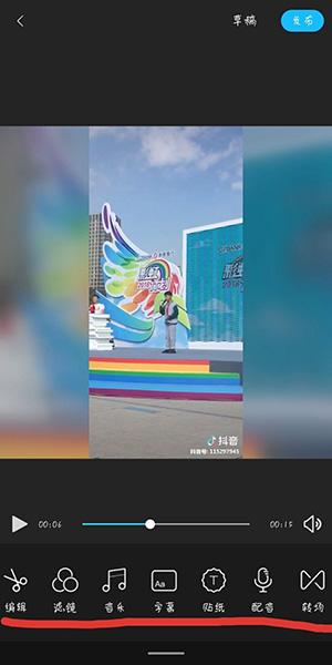 3、在选择或者拍摄好视频后,下方会有剪辑的功能键,例如编辑,滤镜,音乐,字幕,贴纸,配音,转场等。