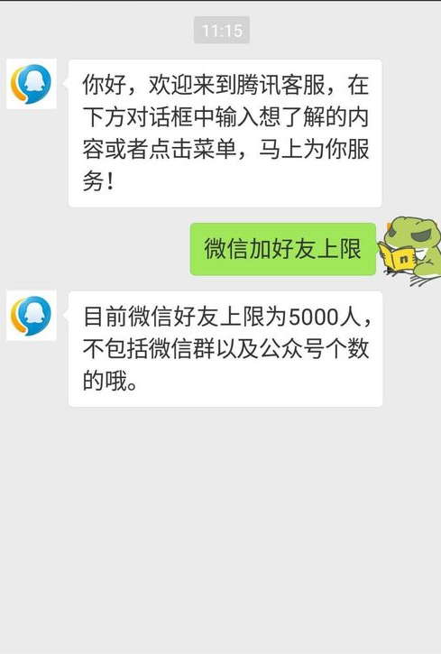 5、发送【微信加好友上限】,之后客服就会回复你【目前微信好友上限为5000人】了。