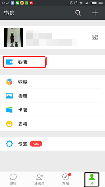 1、打开微信客户端,进入到微信主界面中,点击主界面右下方“我的”功能选项,然后选择“钱包”功能,如下图所示