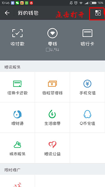 2、进入到“钱包功能之后”,打开界面中右上角的“支付中心”界面,如下图所示