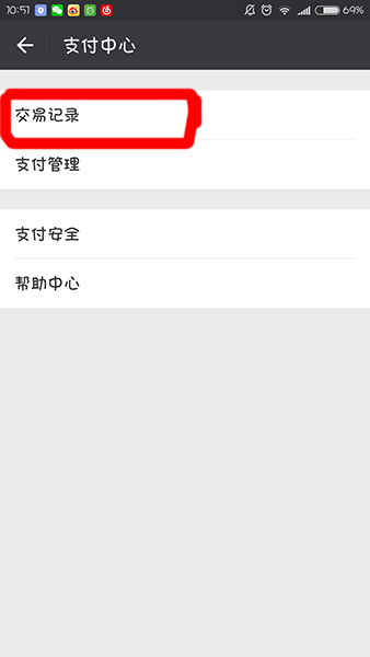 3、进入到“支付中心”之后,然后就可以在这里找到自己的交易记录了,点击打开“交易记录”如下图所示