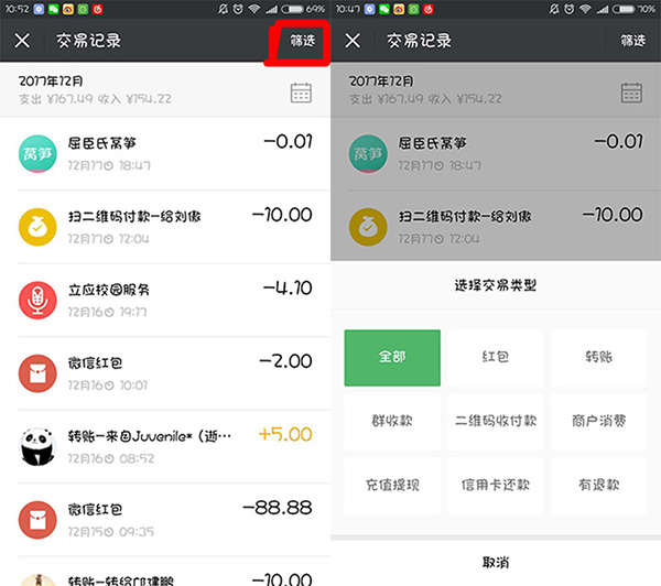 5、如果你只想要删除个别的交易记录,也可以点击右上角菜单,里面会细分日常的交易类别,如下图所示